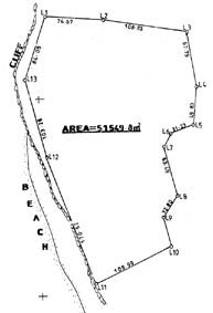 U-shaped is the brick wall surroundiung the 13 acre beach proeperty - the entrance road penetrates the middle of the plot leading towards the 3-bedroom house at the seaside. Adjacent along the Southern border a famous luxury hotel with a slim beach frontage compared to "Dream sand". |