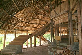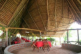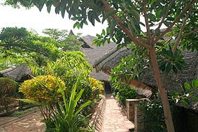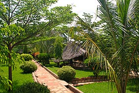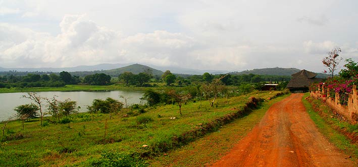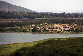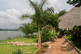 From the neighbouring hills at the shore of the lake the palm thatched roofs of the main building and its surrounding chalets can be seen well. |