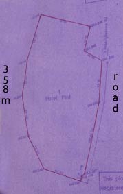 358 meters measures the lake frontage in the title deed. The picture was taken from the promenade which is directly followed by the main buildings. |