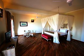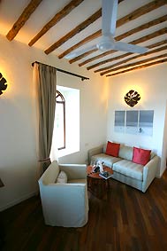 Bureau facilities as well as a sleeper couch in lounge in the suites are standard. Wooden Zanzibar ceiling polls and a South American hard wood parquet are providing and elegant-rustic ambience for all the suites. |