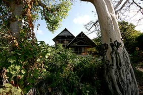 Viewed from the sandy beach patch to the inland side: First the guest cottage and behind the double storey owners residence. As usual all accommodation with sea view. | ||||||||||||||||||||||||||