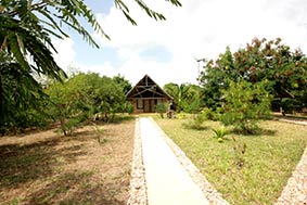 An even cooler condition can be found below the mature trees of the property. The sandy footpath is leading to the accommodations of the lodge