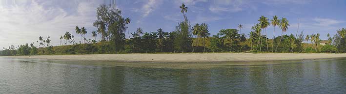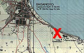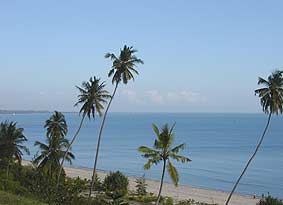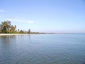 | From the edge of the slope you have the most attractive view over the bay of Bagamoyo and on the other side which is not visible here the eye catches the mangroves of Kaole until the peninsular of the Kasiki lagoon. On this point of view the Old Bagamoyo Road connects the two old historical settlements: Bagamoyo and the more than 800 years old Kaole with its ancients ruins. |