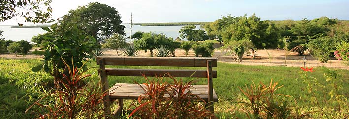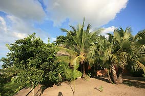 You can also call it the green ecological lodge, because not much remains visible of the main building because it is hidden behind palms and local fruit trees in order to keep a good climate in the building. |