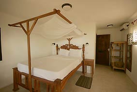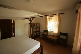 All rooms are ensuite and have air-conditioners. In the main house not even a fan is needed due to the pleasant climate generated by the palm thatched roof and the overshadowing tree. |