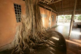 Since decades an huge tree has been growing in the walll of the house and is now overshadowing and protecting the roof of the lodge. To the left the entrance and to the right the restaurant with the bar behind. |