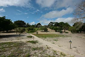 Or stroll down to the lagoon to have a swim. As the picture shows: From the accommodations at the coastal hill the beach slope stretches very long down to the water. |