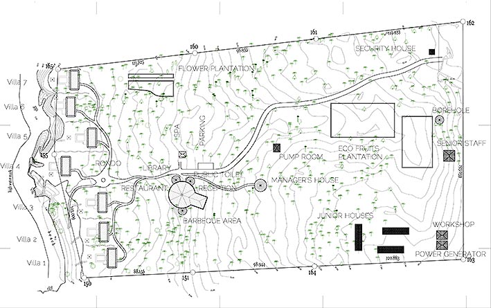 So big that you can get lost in it! Read carefully and try to visiualize all labelled facilities and constructions. The restaurant is built for the guests of 14 chalets and space plus infrastructure on the property is existing to extend the number of cottages. The owner is even offering the newcomer to use his construction team in order to achieve a fast and convenient extension in the same quality.