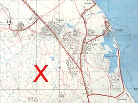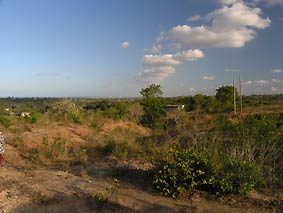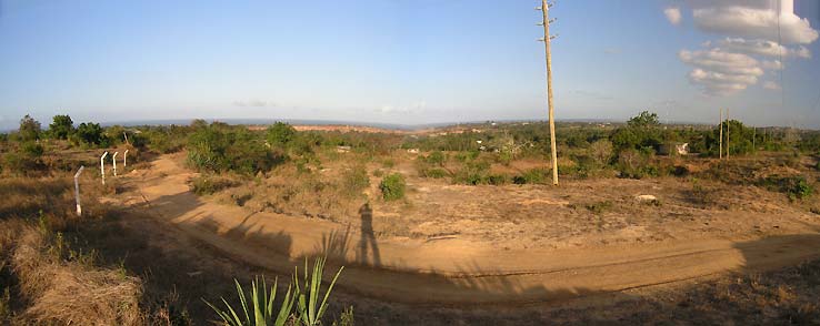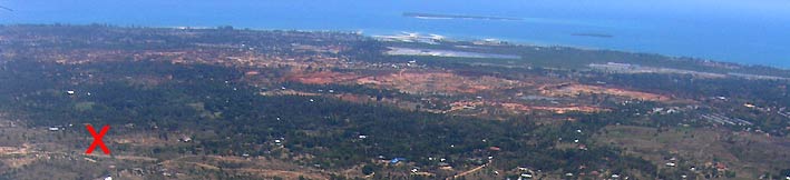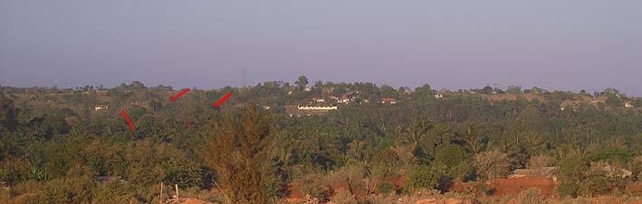 Here Promised land is viewed from the tarmac road which goes to Bagamoyo. The three red lines are marking the approximately borderlines of the property which are here covered by lots of preceding coconut palms. Westwards on top of the ridge where no red stripe marks the border runs the road.