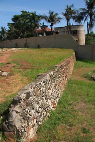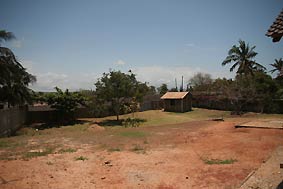 | The top of the plot is separated by a step wall which is decorated by natural coral stones. In the back you can sea the high brick wall and the neighbor mansion behind. |