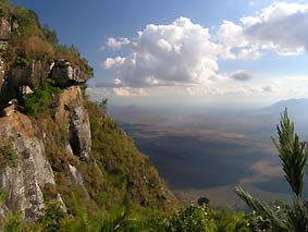 | More than hundred kilometers the view stretches southwards over the huge Masai Steppe. The cliff to the very left belongs to the property as well. Its exposed rocky balconies are inviting for joining the view. |